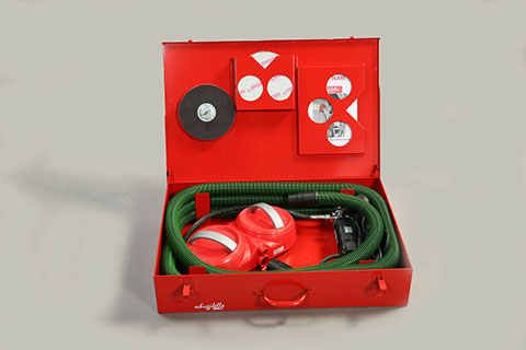 Das Grundgerät besteht aus Motor und Werkzeughalter mit zwei gegenläufig drehenden Scheiben, welche über eine biegsame Welle angetrieben werden. Diese Technik ermöglicht ermüdungsarmes Arbeiten und sorgt für ruhigen Lauf. Die Griffe sind ergonomisch gestaltet, drehbar und erleichtern das Führen des Gerätes. Der Motor wird zur Entlastung der Arme mit einem Gurt am Körper befestigt. Die Schleifrückstände können über einen antistatischen Saugschlauch mit jedem handelsüblichen Industriestaubsauger abgesaugt werden. Die Schlauchlänge von 7m ermöglicht handliches und grossflächiges Arbeiten ohne zusätzliches Gewicht und Lärm auf dem Arbeiter durch Rucksackstaubsauger.