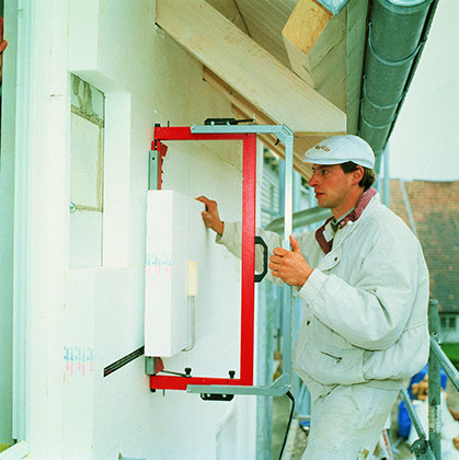 Alle Plattenschneidegeräte von Scaritec zeichnen sich durch das niedrige Gewicht, ihre Handlichkeit, ihre Einfachheit und ihre Flexibilität aus. Sie sind speziell für das Arbeiten auf dem Gerüst entwickelt worden. Mit einem kleinen Handgriff werden sie an bereits (auch frisch verklebten) Dämmplatten befestigt.